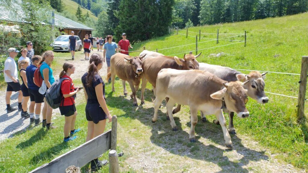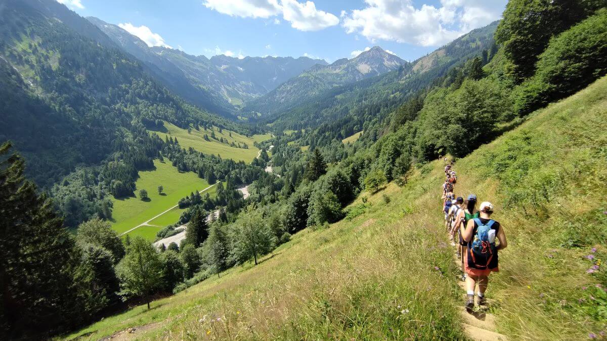 Wir (Geographie-Schüler/-innen der Q11) haben uns morgens in Bad Hindelang am Busbahnhof getroffen und sind von dort aus gemeinsam mit den Geographie-Studierenden der Uni Würzburg zur Talstation der Bergbahn gelaufen. Dann ging es mit der Hornbahn auf das Imberger Horn. Nach einer kurzen Einführung in die Thematik des Tages mit dem Experten Thilo Kreier und einer Diskussionsrunde zum Thema „Grenzgänger“ und der Mountainbike-Problematik, haben wir unsere Wanderung begonnen. Nach ca. 2 Stunden gemütlicher Wanderung bei strahlendem Sonnenschein sind wir an der Sennalpe „Mitterhaus“ angekommen. Dort konnten wir eine kurze Mittagspause genießen und uns etwas erholen, bevor wir mit einem Sinnesweg gestartet haben. In diesem haben wir die Alpenwelt genauer erkunden können und sie mit all unseren Sinnen genießen können.
