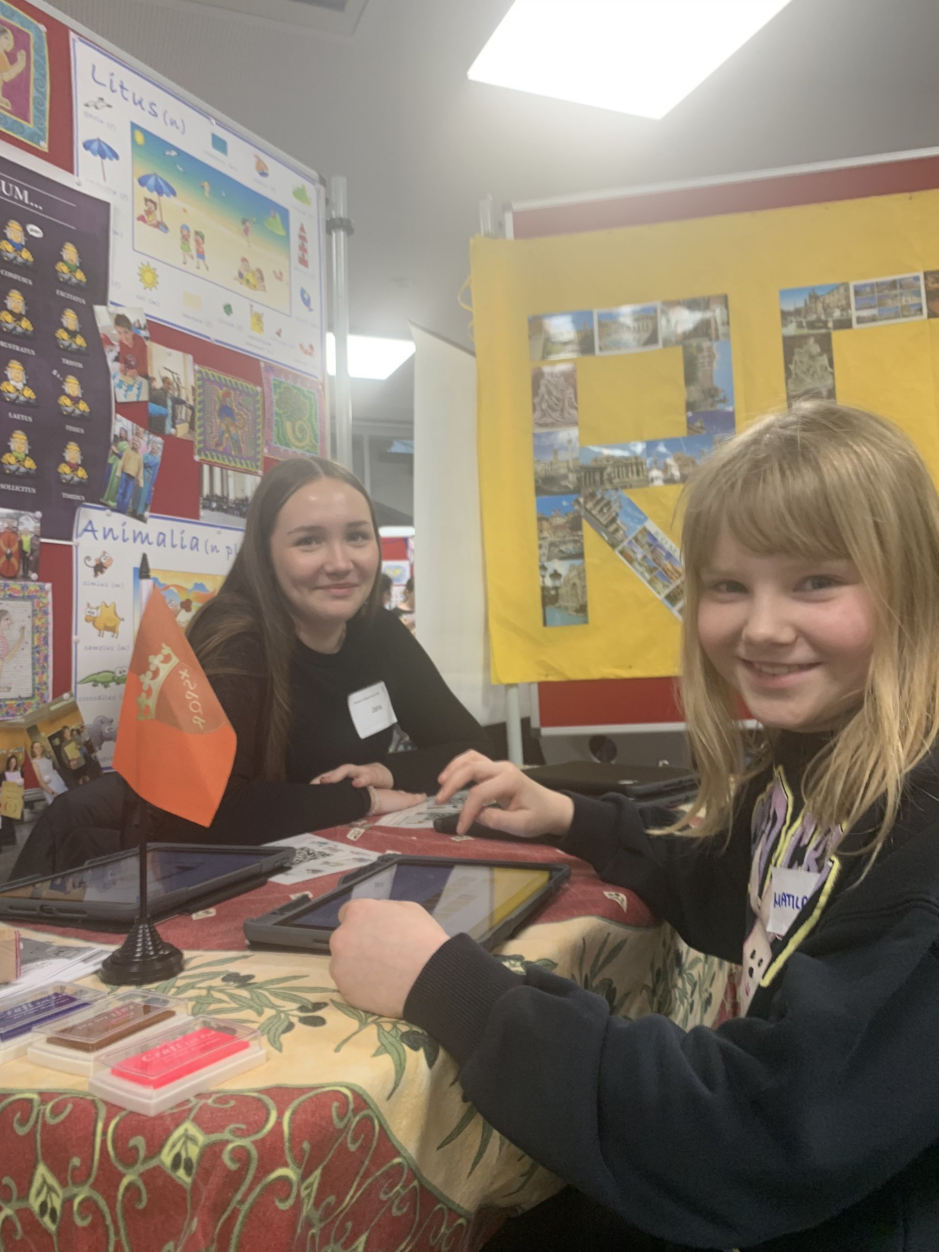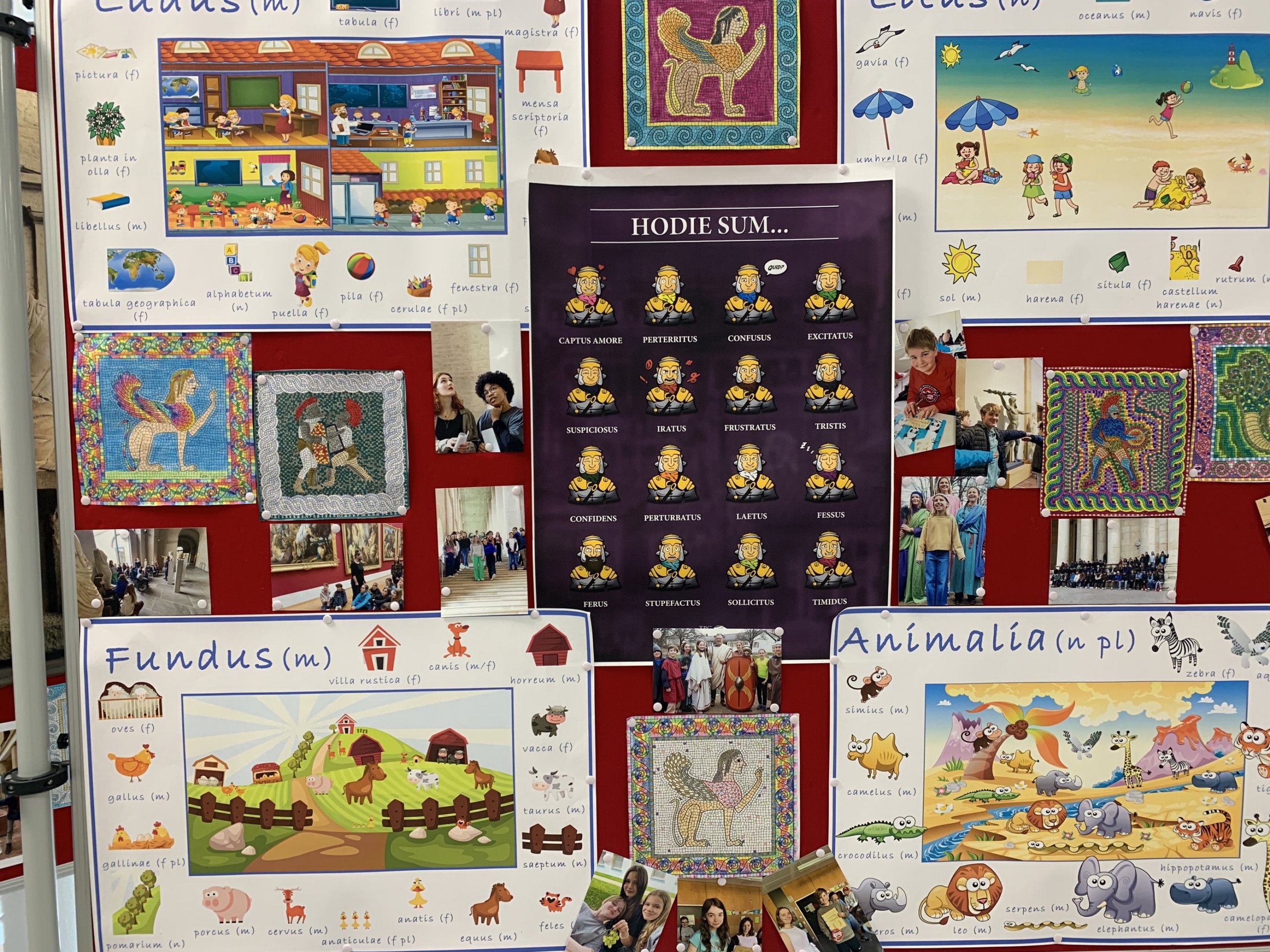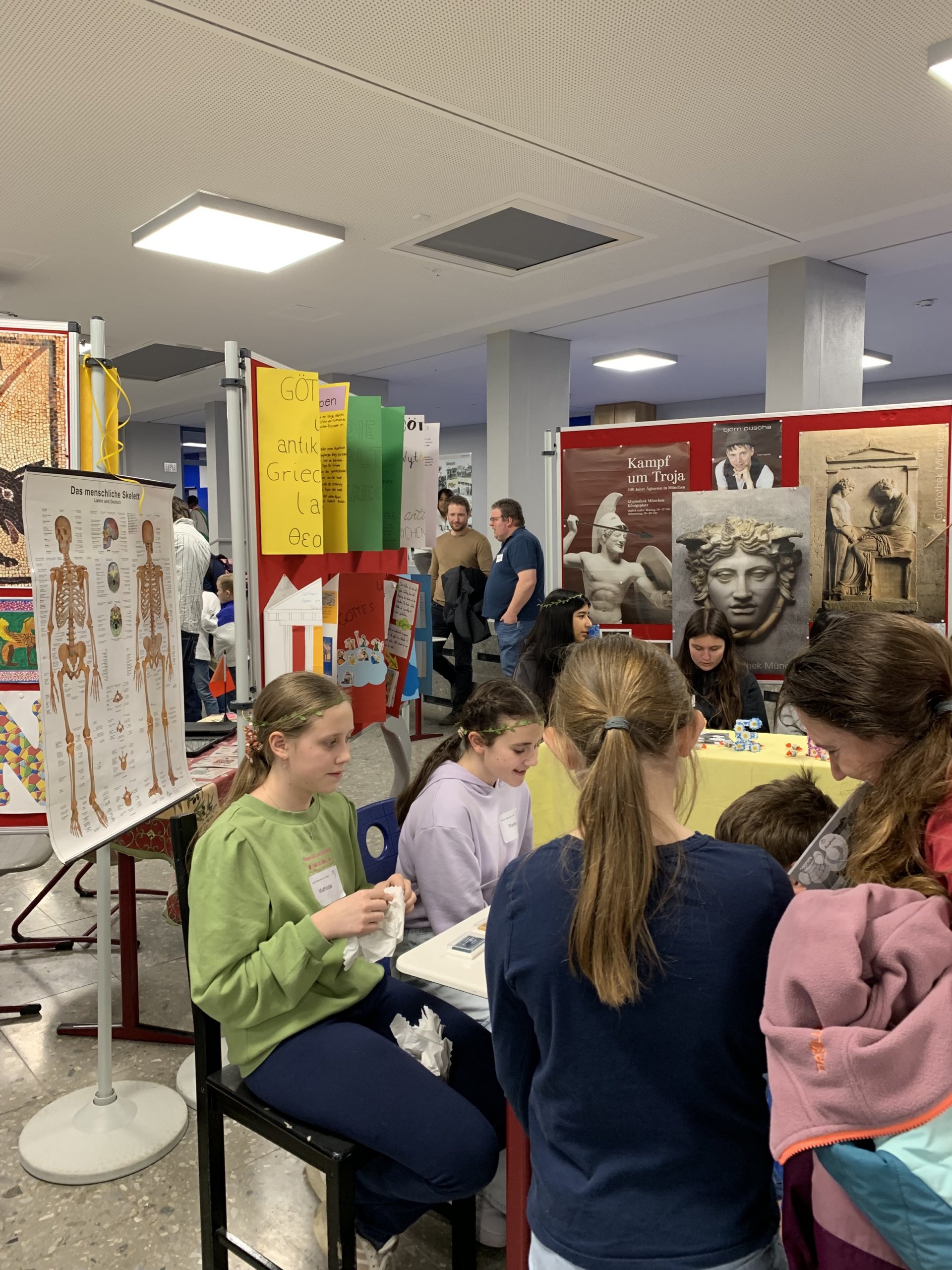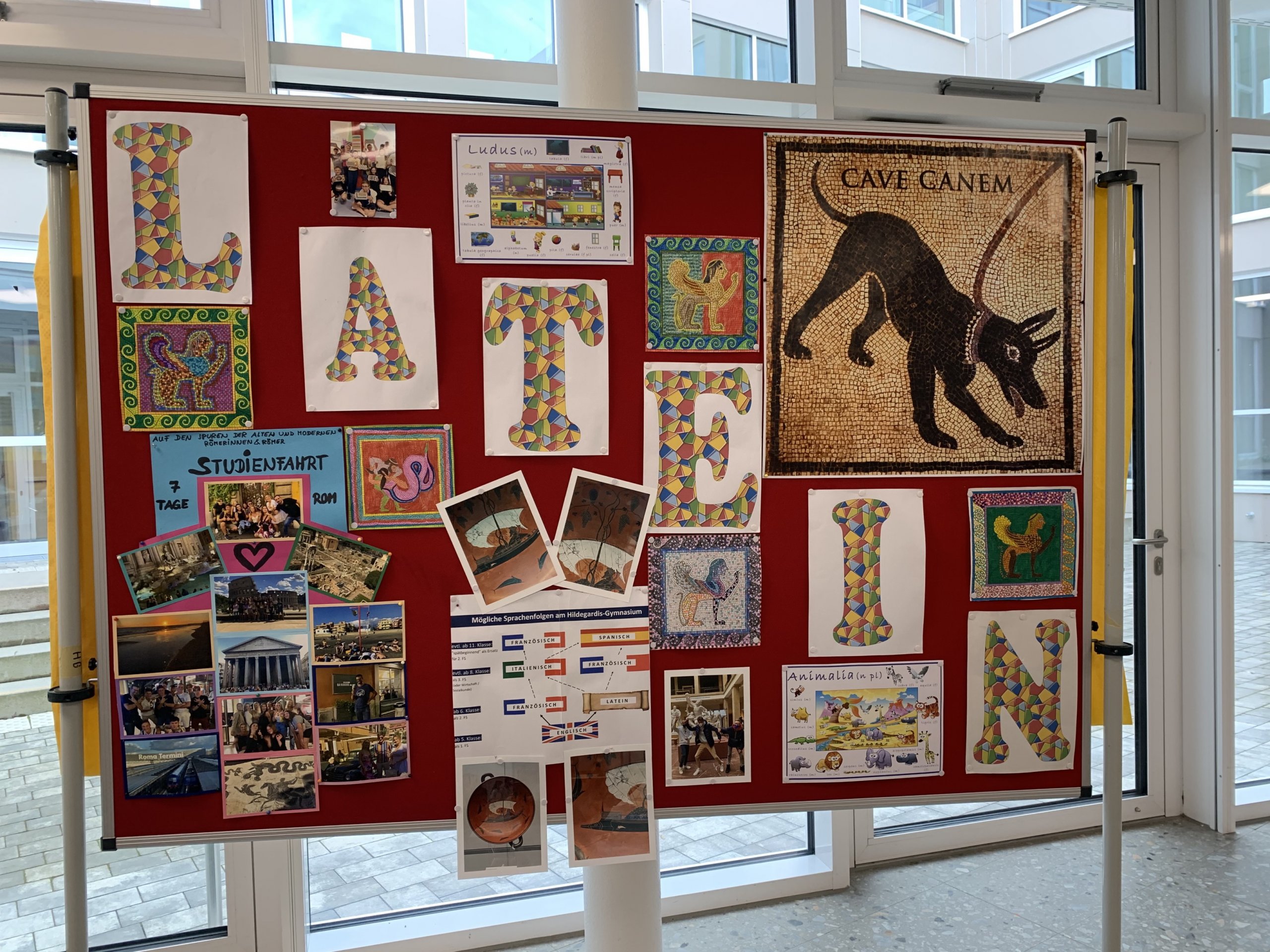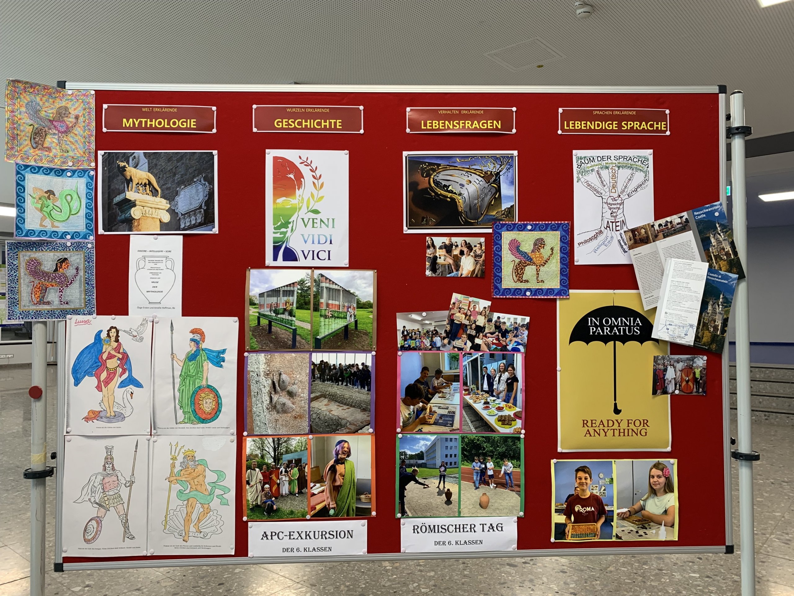 Am Tag der offenen Tür hatten wir für das Fach Latein verschiedene Stände und Aktionen, von denen hier ein paar abgebildet sind. „Himmel und Hölle“ konnte in lateinischer Fassung als „Jupi und Pluto“ gebastelt und gespielt werden. Es gab ein Harry-Potter-Quiz, einen Sprachenbaum, der nun alle Namen derjenigen trägt, die beim Fremdwörterspiel mitgemacht haben, Tablets mit verschiedenen Spielen, wie z. B. einem Göttermemory des Museumspädagogischen Zentrums München, und eine echte Amphore, in die statt Walnüsse wie in römischer Zeit Schoko-Bons getroffen werden mussten, die dann  nach dem Herausfischen aus den Ausgrabungsresten in der Amphore auch verspeist werden durften. Ziel der Stellwände war es einen Eindruck der vielseitigen Lerninhalte des Lateinunterrichts und der diesen ergänzenden Exkursionen und Projekte zu geben, wobei die 4 Hauptbereiche „Mythologie“, „Geschichte“, „Lebensfragen“, „Lebendige Sprache“ eine treffende Zusammenfassung darstellen: