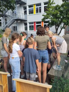 Von Montag, dem 8.7., bis Freitag, den 12.7., gab es ein buntes Programm, bei dem Groß und Klein von- und miteinander lernten. Los ging es am Montag mit der Herstellung von plastikfreier Seife, dann wurden Insektenhotels gebaut, Wimpelketten und Topfuntersetzer aus alten Stoffen hergestellt und der Wochenmarkt besucht, um einen leckeren Obstsalat aus saisonalem und regionalem Obst zu kreieren.