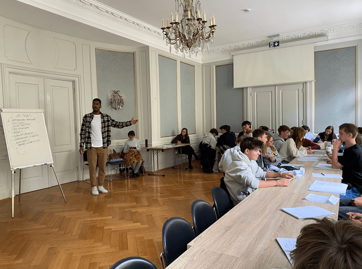 Dieser Frage sind zwölf Schülerinnen und Schüler der 10. Jahrgangsstufe am Montag, den 30.09.24, bei einem Workshop im französischen Institut in München nachgegangen und folgten damit einer Einladung im Rahmen unserer DELF-Partnerschaft mit dem Institut français. Angeleitet wurde dieses atelier d‘écriture von dem kanadischen Künstler Élémo, der mit seiner sympathischen und offenen Art den Teilnehmenden die Poesie des Poetryslams nähergebracht hat. Am Ende des Vormittags haben alle Beteiligten selbst einige Zeilen zu Papier gebracht und können nun mit der eigenen Slam-Karriere durchstarten, wenn sie den Mut haben ihre Worte live zu präsentieren.