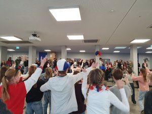Sportlich-musikalischer Höhepunkt der Pausenfeierlichkeiten war ein Flashmob zum Hit „Avenir“ der französischen Sängerin Louane. Eine Truppe tanzbegeisterter Schülerinnen und Schüler hatte die Choreographie unter der Anleitung von Sportlehrerin Patricia Argauer vorbereitet und das Publikum absolut schrittsicher und ausdrucksstark in der Aula zum Mittanzen motiviert.