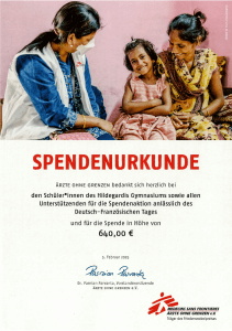 Die Pausenaktionen erwirtschafteten einen ansehnlichen Gewinn, so dass 640 Euro an die Organisation „Médecins sans frontières / Ärzte ohne Grenzen“ überwiesen werden konnten.