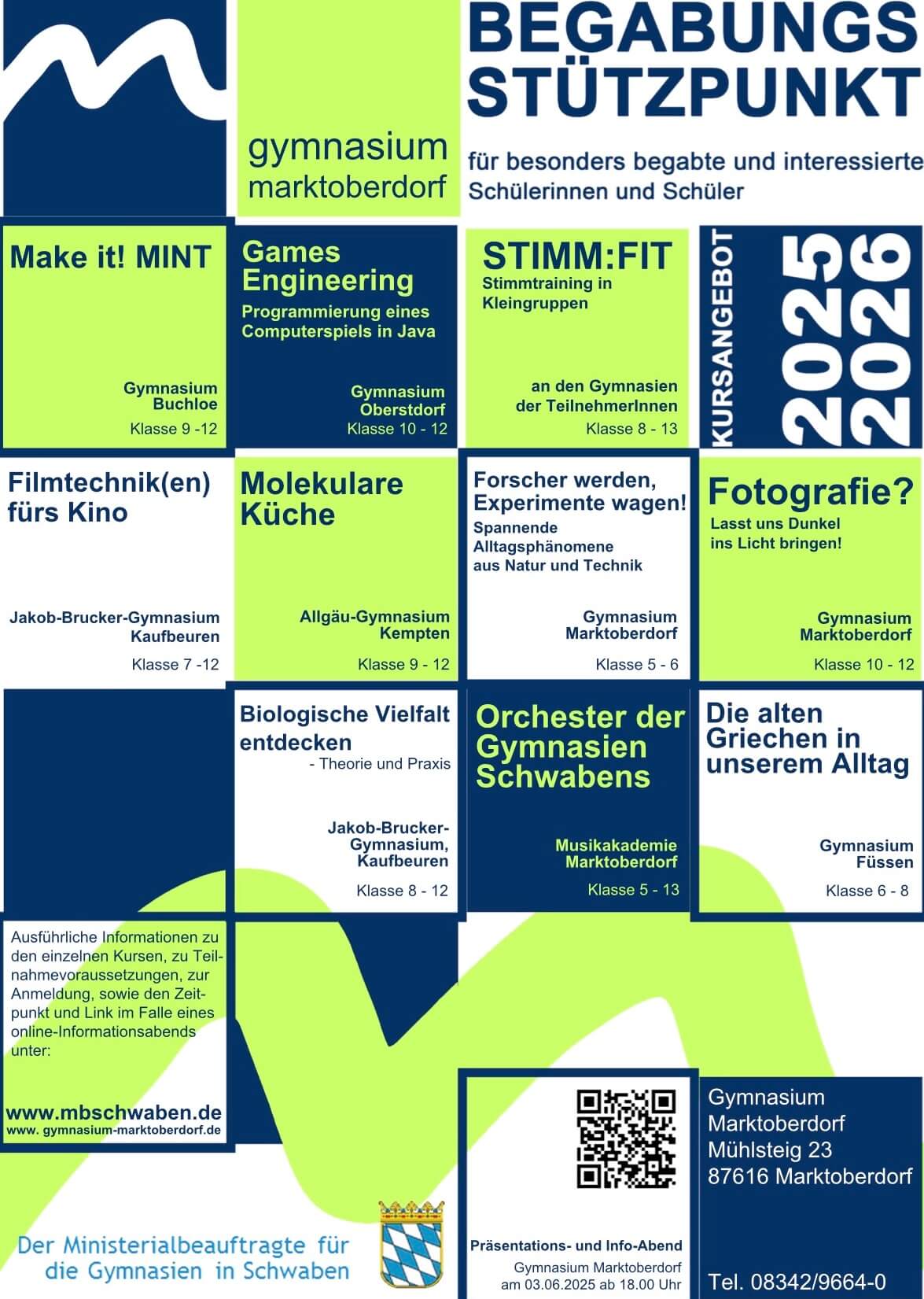 Wir möchten Sie über die unmittelbar anstehenden Termine für die Begabungsstützpunkte Memmingen und Marktoberdorf informieren und zu den Informationsveranstaltungen herzlich einladen. Dort werden Inhalte der Kurse des Schuljahres 2025/26 vorgestellt sowie Ergebnisse der momentan noch laufenden Kurse präsentiert. Musikalisch umrahmt wird die Veranstaltung in Marktoberdorf u. a. vom Kurs STIMM:FIT, den einige Schülerinnen unserer Schule mit großer Begeisterung besuchen. Auch in Memmingen können Sie/ kannst Du musikalische Eindrücke eines aktuellen Kurses bekommen. Der sehr beliebte Kammermusik-Kurs wird einige Stücke für die Besucherinnen und Besucher spielen.