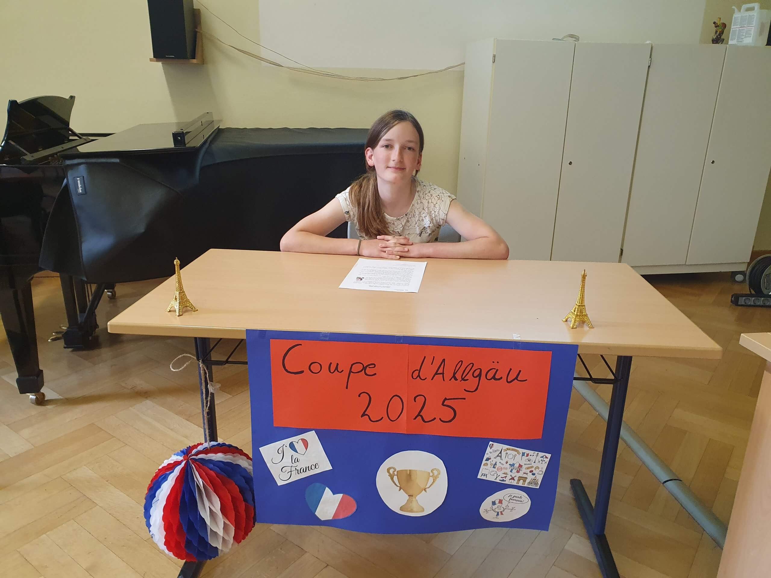 Bernadette Aries (7c), unsere Schulsiegerin des französischen Vorlesewettbewerbs, stellte sich am Donnerstag, den 26.06.2025 dem regionalen Wettbewerb Coupe d´Allgäu, für den sich 12 junge Französischschülerinnen und -schüler Allgäuer Gymnasien zwischen Lindau und Memmingen zusammen mit ihren Französischlehrkräften am Carl-von-Linde-Gymnasium versammelt hatten. Wie in der schulinternen Runde galt es, der Jury zwei französische Texte möglichst korrekt und ausdrucksstark vorzulesen, einen bekannten und einen unbekannten. Besonders beim unvorbereiteten Text konnte Bernadette punkten und las souverän, spannend und fast fehlerfrei über alle schwierigen Passagen hinweg. Insgesamt fehlten bei starker Konkurrenz für ein Siegertreppchen dennoch ein paar Jurypunkte und so durfte Bernadette einen Preis und eine Urkunde für einen hochverdienten vierten Platz entgegennehmen. Bien joué, Bernadette!
