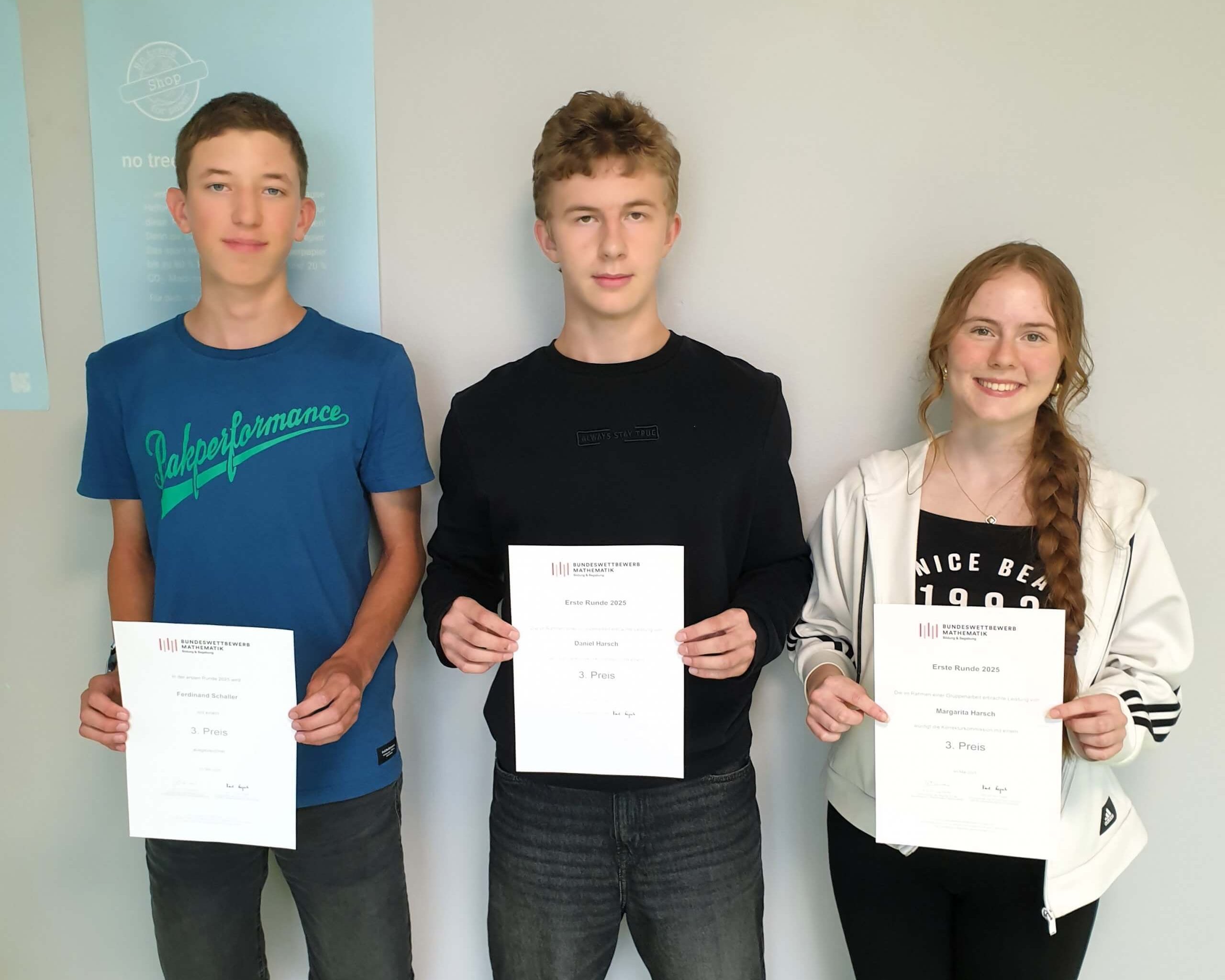 Margarita Harsch, Daniel Harsch (beide Q12) und Ferdinand Schaller (11 b) haben in der 1. Runde des Bundeswettbewerbs Mathematik 2025 einen erfreulichen 3. Preis gewonnen und sich damit für die zweite Wettbewerbsrunde qualifiziert.