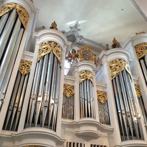 Zuerst besichtigten wir die Sankt-Mang-Kirche. Die früher katholische Kirche ist jetzt Heimat der evangelischen Gemeinde. Sie besitzt drei Orgeln. Die größte davon hat 4 000 Pfeifen, ist über 300 Jahre alt und wurde vor kurzem komplett saniert.
