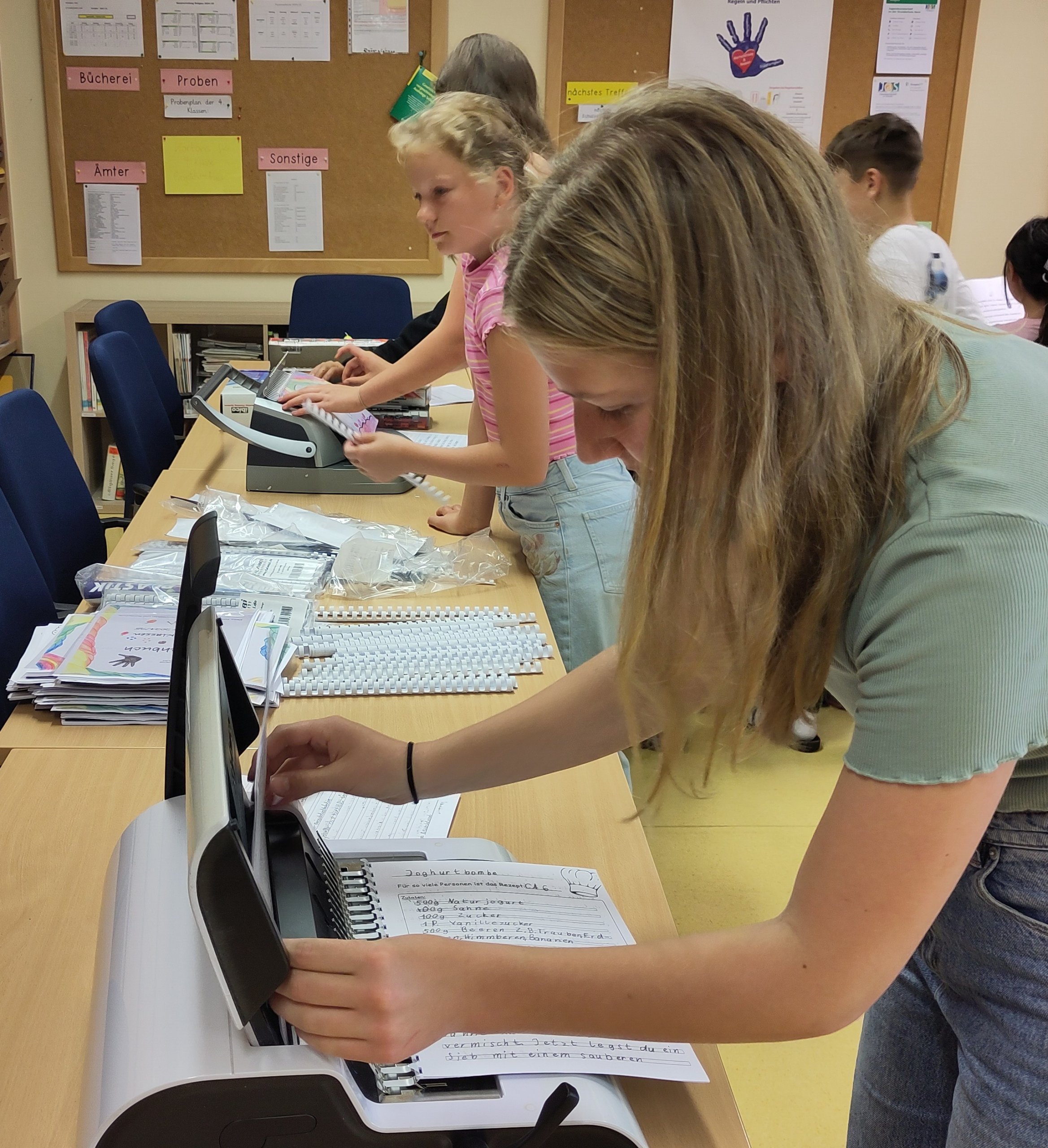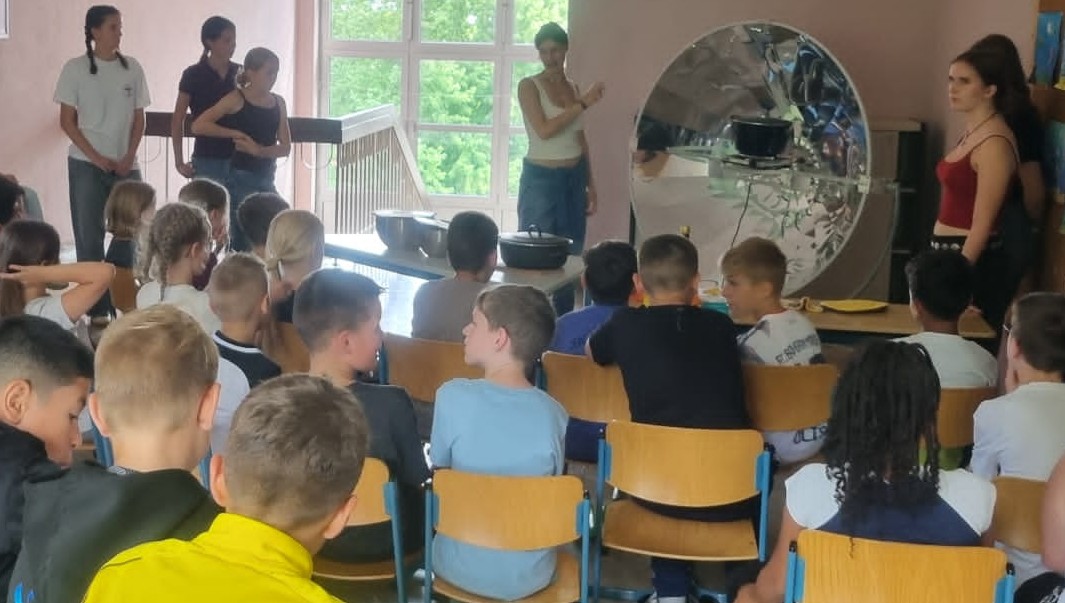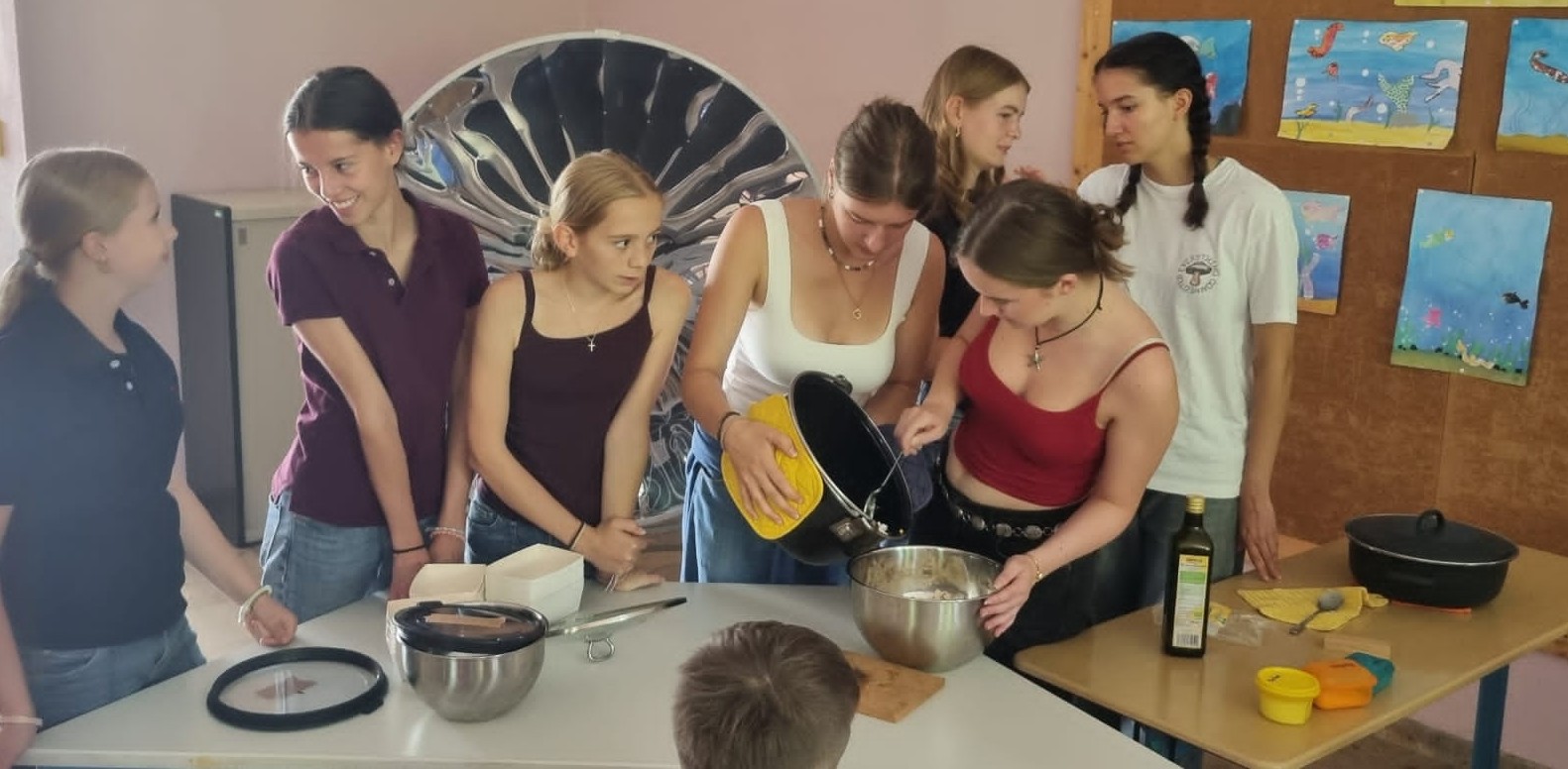 Schon zum dritten Mal führten Schülerinnen und Schüler des Hildegardis-Gymnasiums erfolgreich eine „Patenprojektwoche“ zum Klima- und Umweltschutz an der Nordschule durch. In Kooperation und begleitet von Frau Nissels (Nordschule) und Frau Karl-Wörner (Hildegardis-Gymnasium) entwickelten sie Ideen für den Unterricht, die dann vom 21. bis 25.7.2025 in die Realität umgesetzt wurden: So beschäftigte sich die erste Jahrgangsstufe mit dem Thema „Wiesentiere“ und fertigte aus Milchkartons kleine Kressetöpfchen an, die dritten Klassen erstellten zum Thema Tierwohl und Ernährung ein vegetarisches Kochbuch und machten leckeren Couscous-Salat, die vierten erfuhren, wie man die Sonnenenergie zum Kochen (z.B. von Popcorn) nutzen kann und bauten eigene Solaröfen – leider war es so regnerisch, dass letztere noch auf ihren Einsatz warten müssen… Auch in der zweiten Jahrgangsstufe durften die Hildeschülerinnen und -schüler beim Thema „Klimafreundliche Ernährung“ unterstützen.
