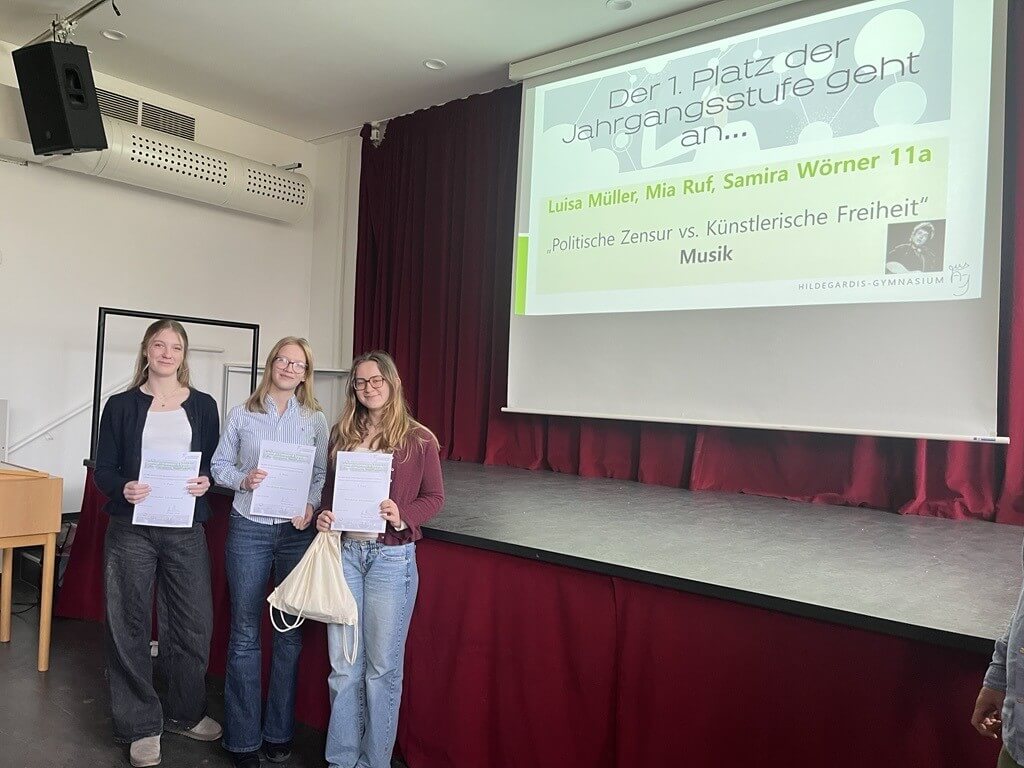 Im Rahmen einer kleinen Preisverleihung wurden ausgewählte Arbeiten besonders gewürdigt. Den 1. Platz erreichte die Arbeit „Politische Zensur vs. Künstlerische Freiheit“ im Fach Musik, die von den Schülerinnen Luisa Müller, Mia Ruf und Samira Wörner der 11a erstellt wurde.